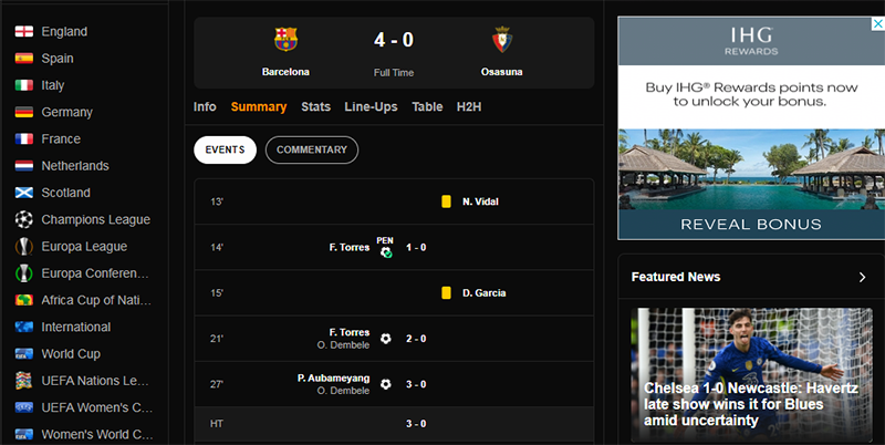 - Thông tin chi tiết sau trận đấu được cập nhật rất chi tiết.